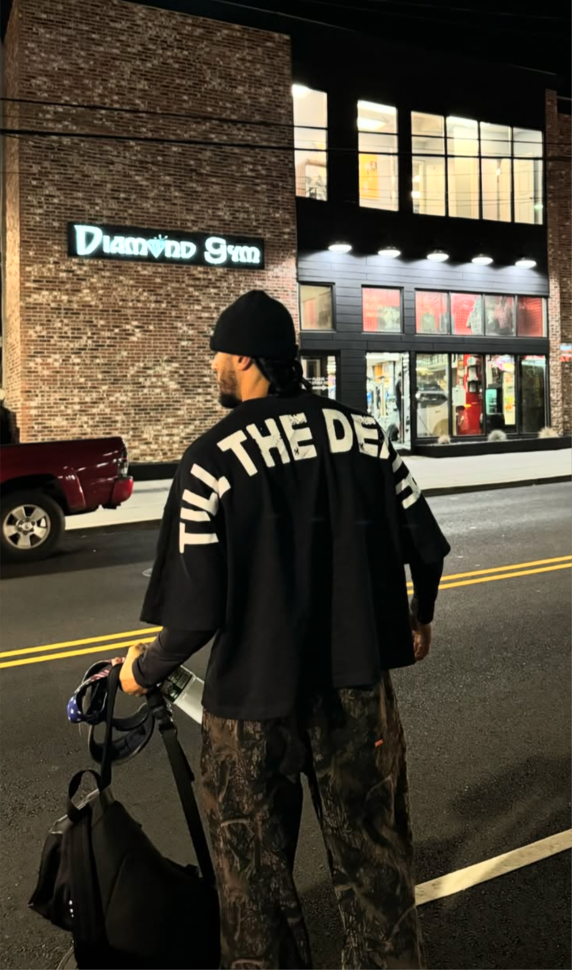 "Effortlessly elevate your style with our Black "villain arc" Graphic pump cover. This oversized t-shirt features the bold statement, "Till the death" on the back, adding a touch of edgy appeal to any outfit. Made with high-quality materials, you'll love the comfortable fit and eye-catching design. Perfect for those looking to make a statement."